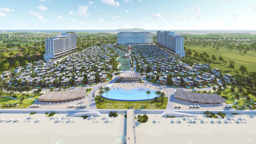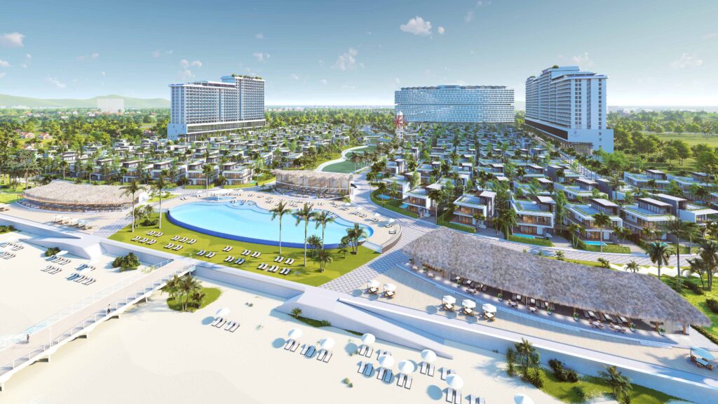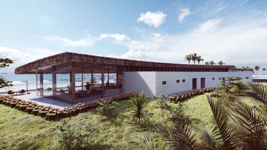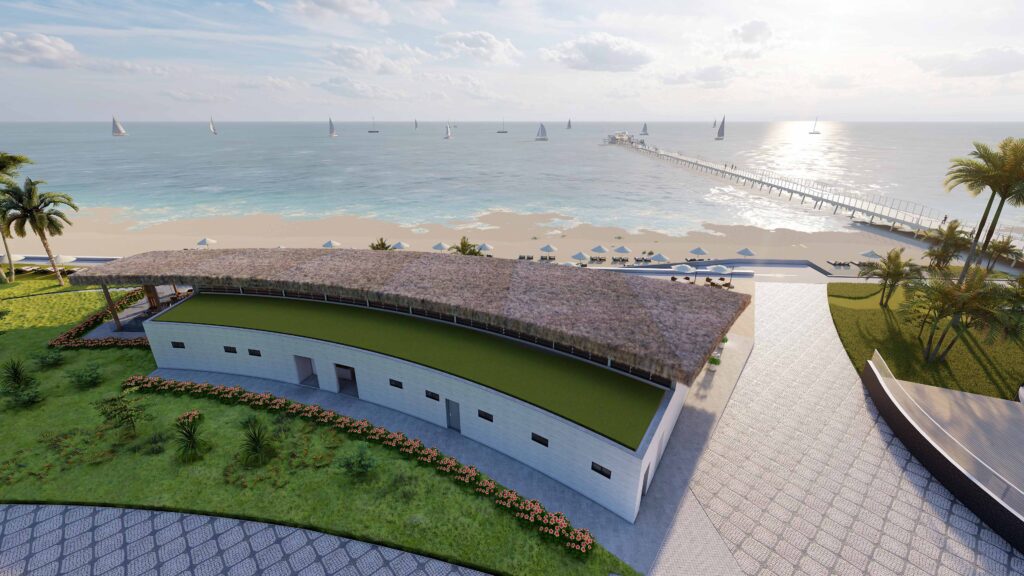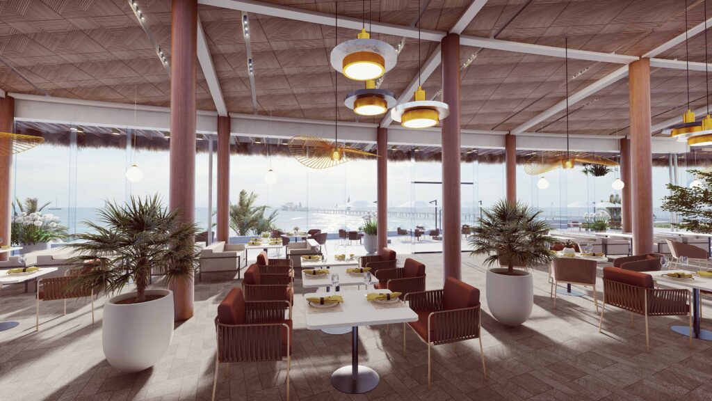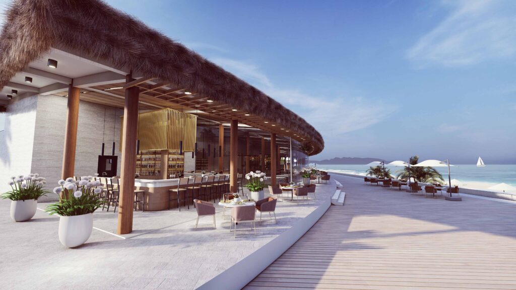 - Depuis la terrasse du Beach Club à Droite, au loin dans l’axe principal, on peut admirer la jetée vers la mer du The Maris, qui permet l’accès au The Maris par bateau.