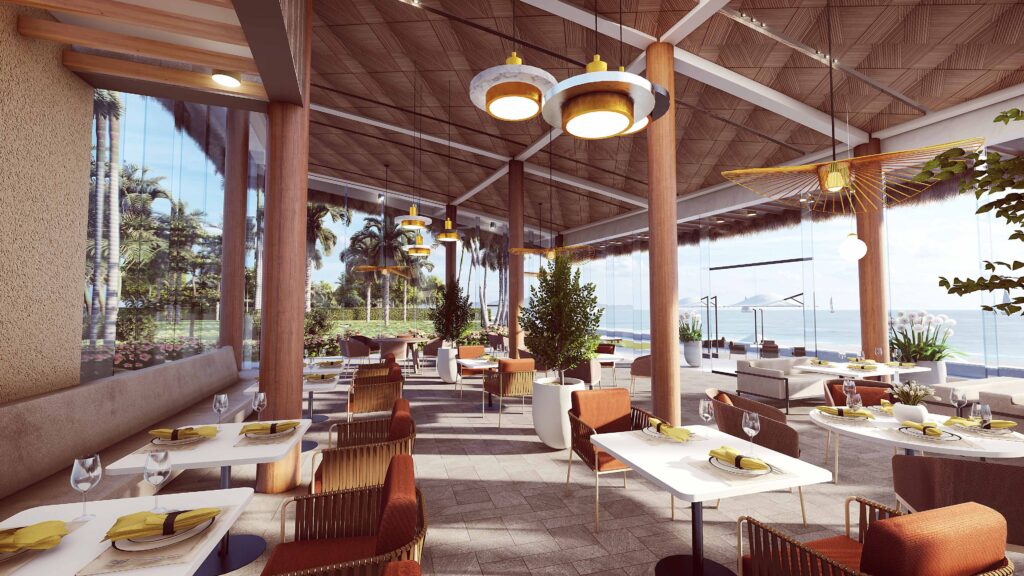 - Le Restaurant Beach Club à Droite est un bar-lounge-restaurant qui propose de la cuisine japonaise (sushi), un grand bar ouvert à l’extérieur face à la mer, un bar à l’intérieur, une très grande terrasse face à la plage et l’océan Pacifique.