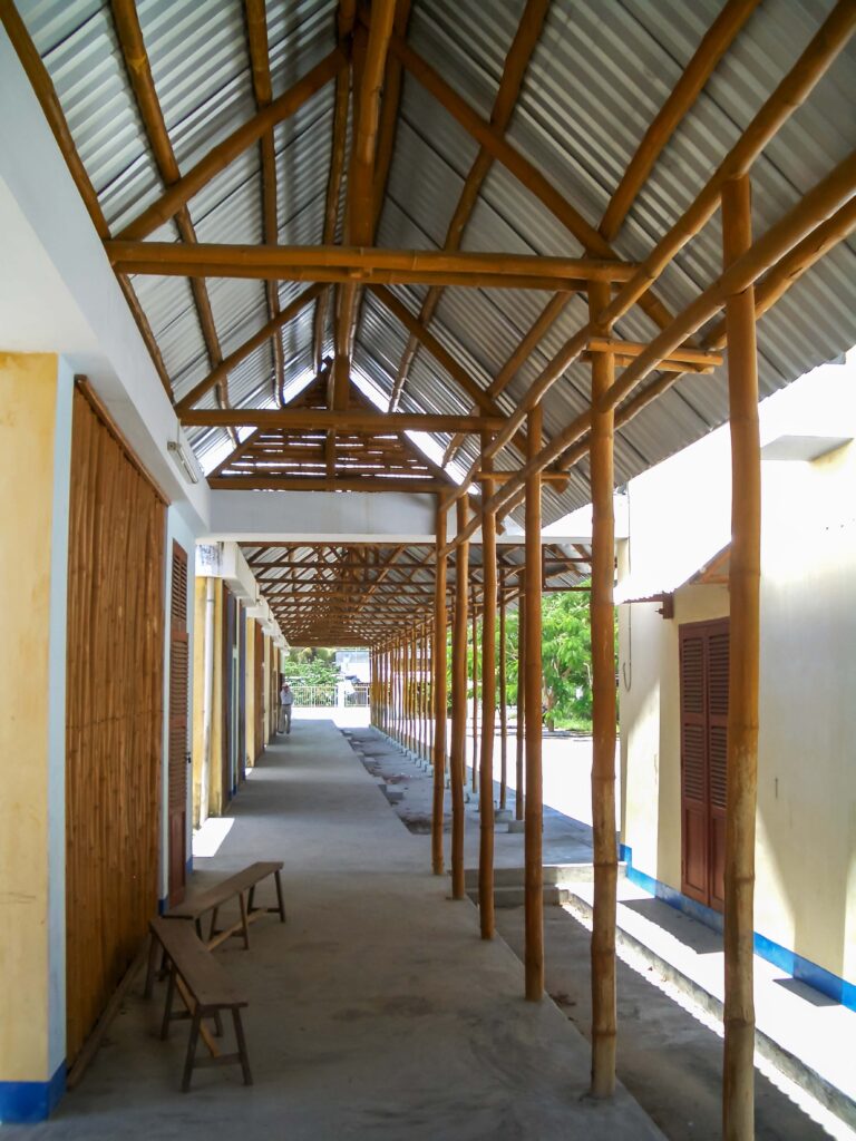 Galerie centrale de colonnades de bambous, qui privilégie la ventilation naturelle des vents de la mer