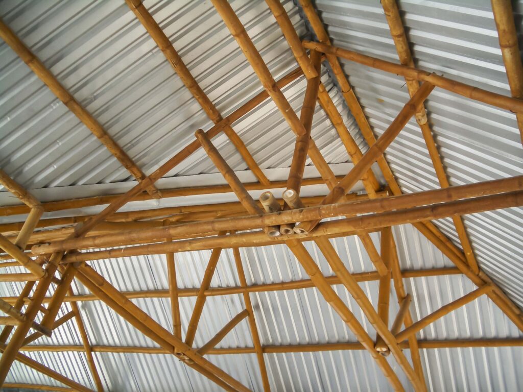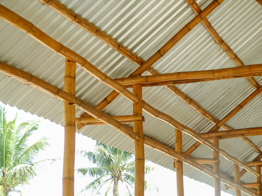 Nous avons privilégié des matériaux à faible empreinte carbone, locaux, peu coûteux et ne nécessitant aucun transport. Les structures de toit ont été préfabriquées hors site puis assemblées. Les tiges de bambou étaient attachées avec des cordes en rotin et boulonnées à intervalles réguliers pour former les fermes. Des colonnes en béton armé soutiennent la toiture, le sol est en béton brut qui se patinera avec le temps, et les murs de briques sont enduits à la chaux.